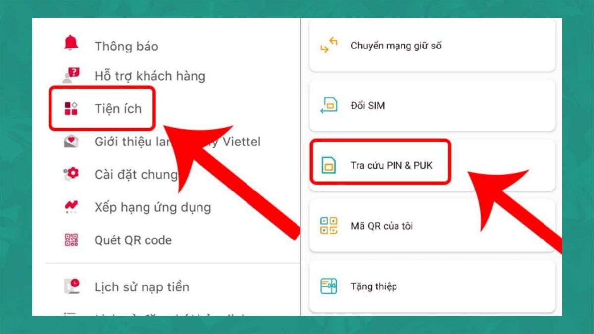 Bước 3: Chọn mục Tiện ích và chọn tiếp mục Tra cứu mã PIN & PUK.